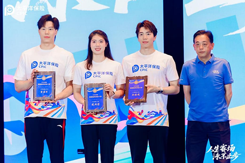 中国太保集团副总裁俞斌向张雨霏、覃海洋、孙佳俊等三位冠军授予“太平洋保险健康服务体验大使”称号。运动员们以自己的生活经验,与观众们畅聊“健康生活、快乐工作”的理念,呼吁大家要热爱运动,培养良好的生活习惯,牢牢守护住自己的健康。