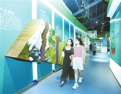 在长子精卫湖国家湿地公园科普馆内,参观者驻足观看,了解浊漳河流域水生态知识