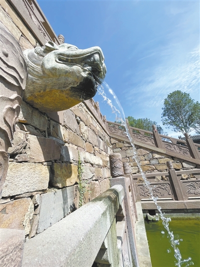 源头之水自古在老石墙上的兽首石雕口中潺潺流出