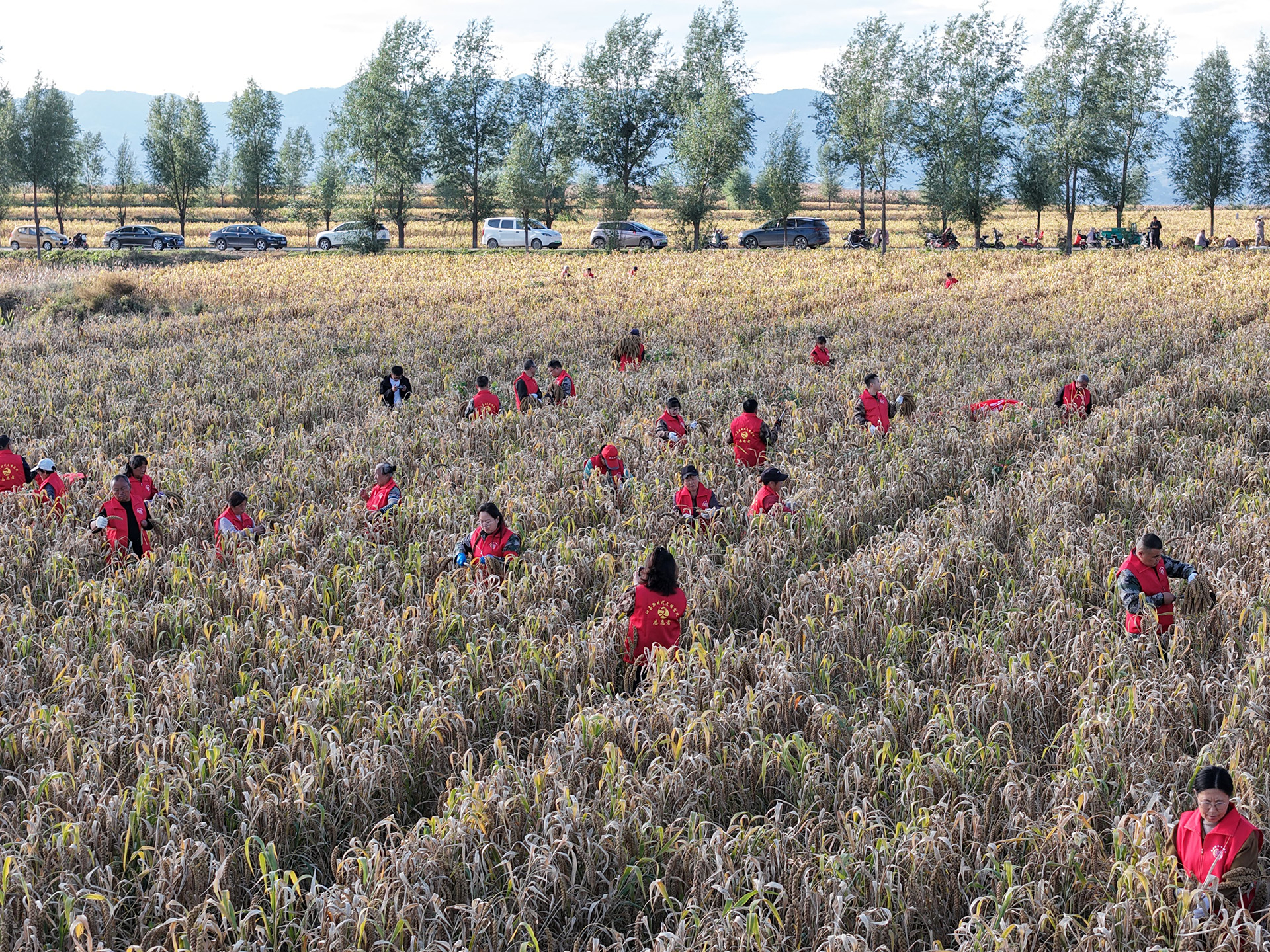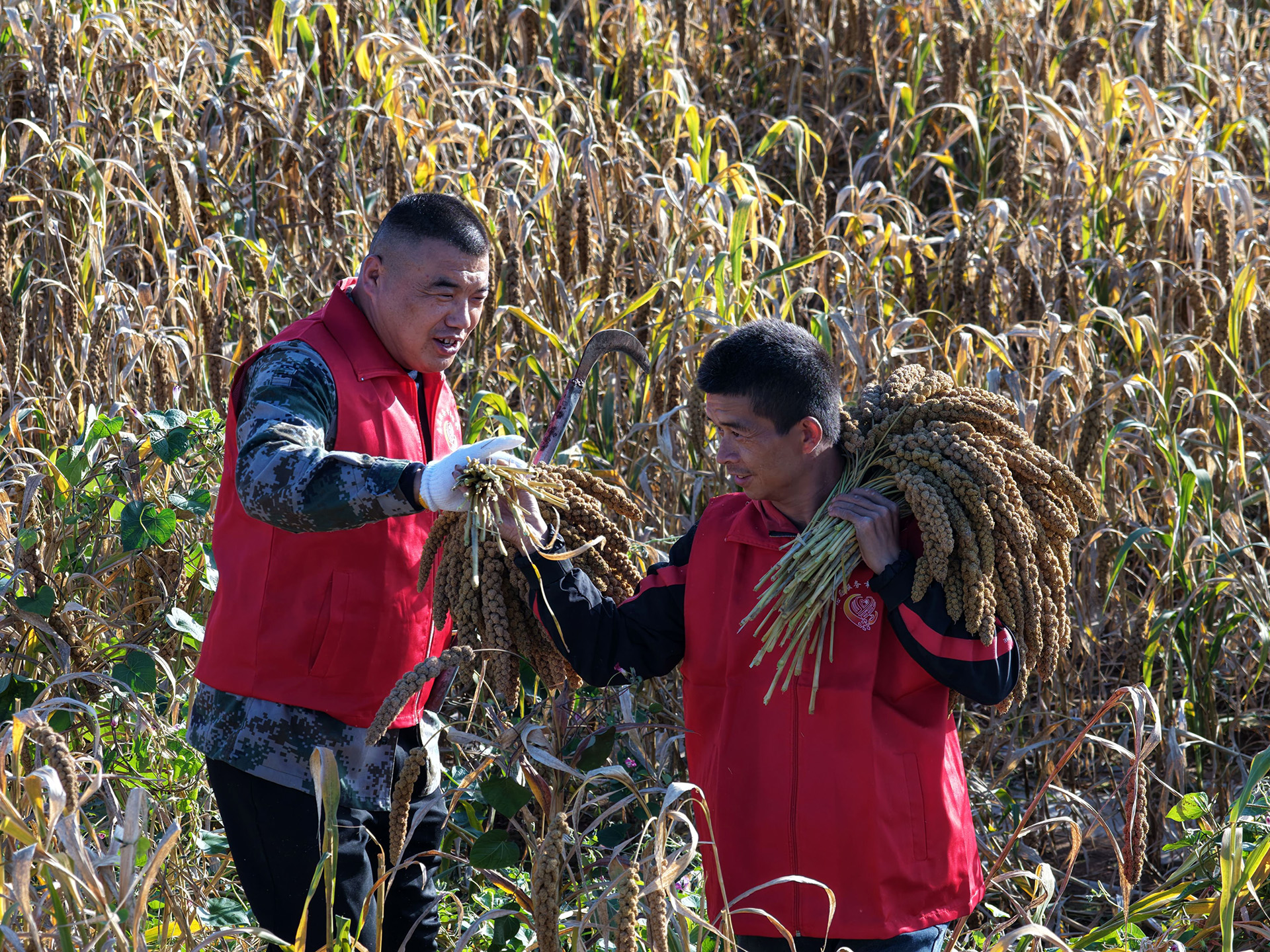 在谷子种植基地,大片的谷子因雨水浸泡,出现了倒伏现象,若不及时抢收,将面临发芽、霉变的风险。“红马甲”们不畏泥泞,分工协作,有的挥舞镰刀收割谷子,有的负责将割下的谷子搬运到田边,争分夺秒与时间赛跑。