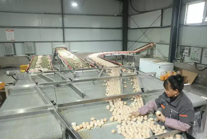 在车间短短几分钟,我们看到从鸡舍传送下来的数不清的鸡蛋经过传送带集成蛋链匀速滑过,进入鸡蛋桌收集好后,开始通过排列机先将原料蛋捡到进料滚轴上,机器自动将原料蛋调整分流至清洗系统内;鸡蛋被水淋湿,毛刷刷鸡蛋蛋身,后面把鸡蛋进行烘干,表面紫外线杀菌处理,对鸡蛋进行涂油保鲜,调整后的鸡蛋进入多维度检测通道,主要进行脏蛋检测、裂纹检测、血斑检测等。鸡蛋首先进入自动脏蛋检测系统,系统采用全彩色相机+专利镜面光技术,对鸡蛋表面进行扫描,对鸡蛋的污垢程度进行分级分类;然后鸡蛋进入裂纹检测单元,通过压电式感应分析技术,识别蛋壳微裂纹(包括壳膜未破的隐裂蛋),最多可分为15个级别;鸡蛋继续进入血斑检测系统,通过穿透式光源扫描蛋体内部,识别蛋黄/蛋清中的血液残留物;鸡蛋经过多维度检测后,进入称重系统,根据设定的鸡蛋重量对鸡蛋进行分级;随后对鸡蛋可以喷码,喷上客户品牌名字和日期,再进行大小头调整,利用偏心原理,将鸡蛋调整为统一头尾方向;而分级机主机实时整合脏蛋等级、重量、裂纹、血斑等多维度数据,生成每枚鸡蛋的综合评级,并通过气动阀门将合格蛋按等级分流至对应包装道,对于鸡蛋可以装盒和装托,包装完毕后至成品输送系统进行仓储,不合格蛋(如裂纹、血斑、严重脏蛋)通过独立通道剔除至残次蛋收集区,然后所有的工序就完成了。