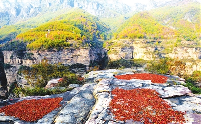 平顺的石墙院坝中,山楂果是初冬最艳的底色:竹席铺展如红毯,剖开的红果裹着白霜,切成薄薄一片,阳光一晒,酸甜香便漫过石墙,和场院里待收的玉米穗香缠在一起。山间,层叠的梯田还留着丰收的余韵,与远处的彩叶崖壁相映,连石缝里的枯草都裹着丰收的暖黄。