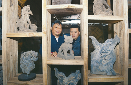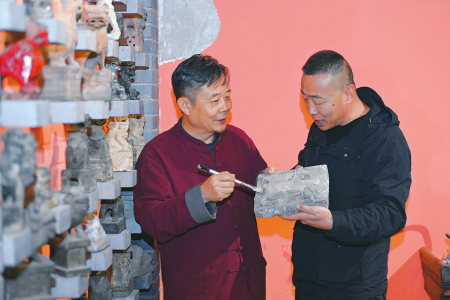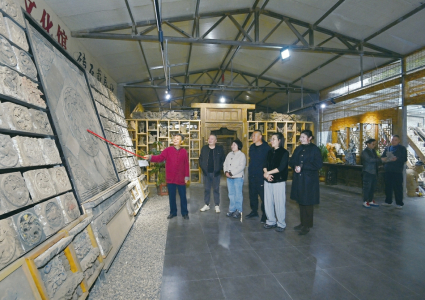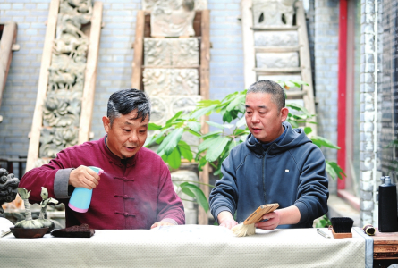 肖红卫(中)与学员探讨成品拓片与砖雕原物的比例效果及文化艺术联系。