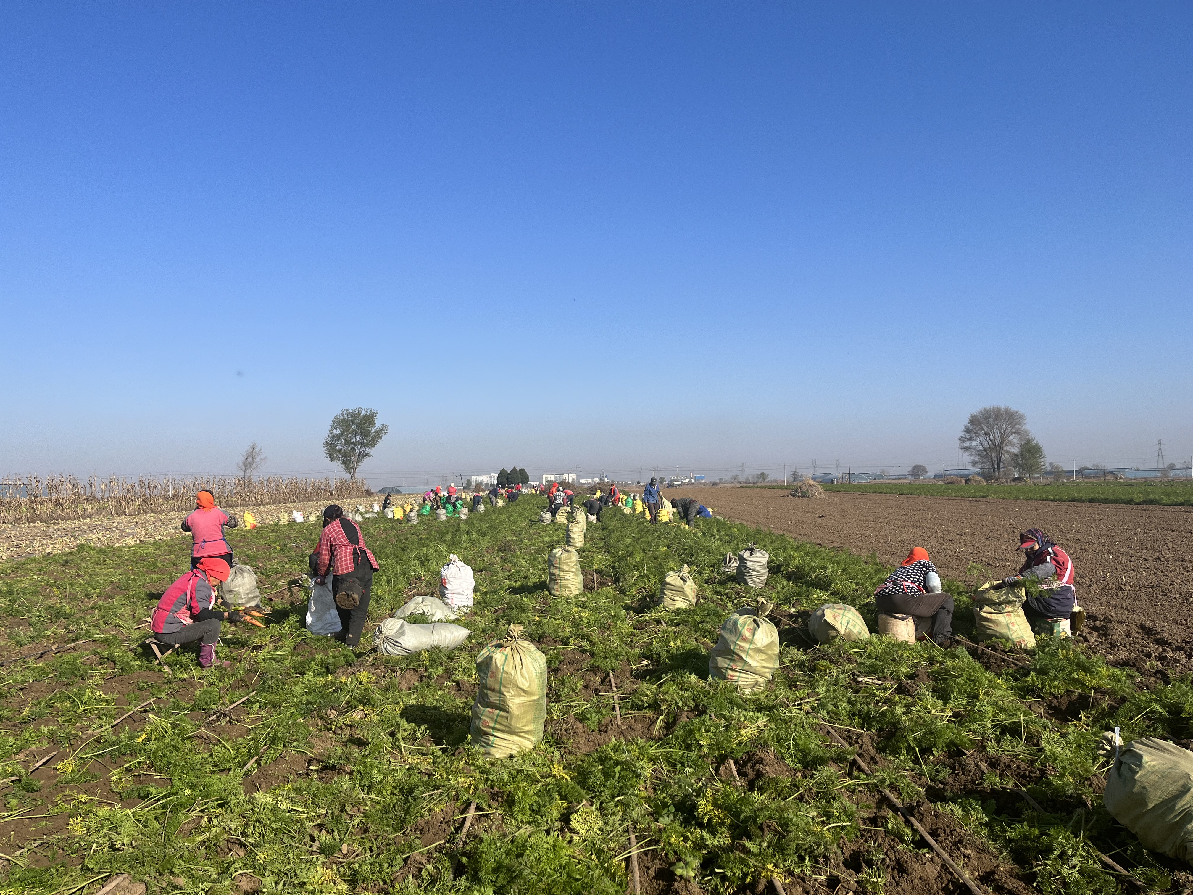 11月17日,在齐民庄村的胡萝卜种植基地里,翠绿缨子随风轻摇,饱满的橙红果实破土而出,种植户分工协作,采收、去缨、装袋,映衬出一片丰收的景象。