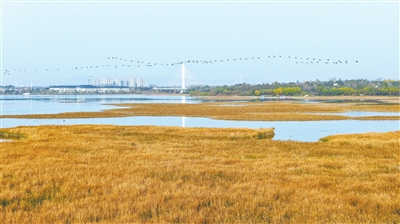 漳泽湖“太行天池”的芦苇荡铺成金黄的绒毯,五彩斑斓的树木点缀着河岸,湖面清澈如镜,倒映着岸边的树木,与常青的松柏交织,构成了一幅绚丽的冬日图景。成群的水鸟在河面上悠然游弋,时而展翅掠过水面,发出清脆的鸣叫,为这宁静的冬日注入了一抹生机。