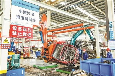 11月29日,在山西瑞赛格废弃资源综合利用有限公司,工人在拆解报废机动车。目前,该公司已具备年拆解3.5万辆报废汽车的生产能力,每天每条生产线拆解达100辆。(梁栋摄)