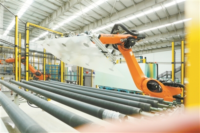12月2日,山西日盛达光伏材料有限公司的智能化生产车间内,机械臂正在高效作业。该企业采用最新超薄压延成型工艺,生产出厚度1.6毫米超薄光伏玻璃,引领轻薄智能的行业潮流。(李阳鸿)
