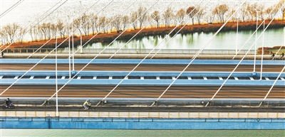 12月8日,滨湖大道沿线冬日美景如画,碧绿的湖水和充满现代感的桥梁相映成趣,市民骑行其间,勾勒出一幅城景相融的生态画卷。(李燎原摄)
