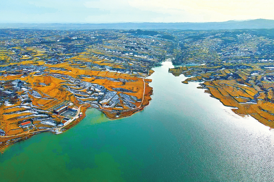 12月21日,俯瞰长治市屯留区屯绛水库,水面波光粼粼,与蓝天、黄土相映,绘就冬日生态画卷。近年来,当地持续加强生态保护修复,推进“调水、控污、清淤、畅通、扩绿、增长”,为群众营造了舒适宜人的生态家园。(杨晨玉 摄)