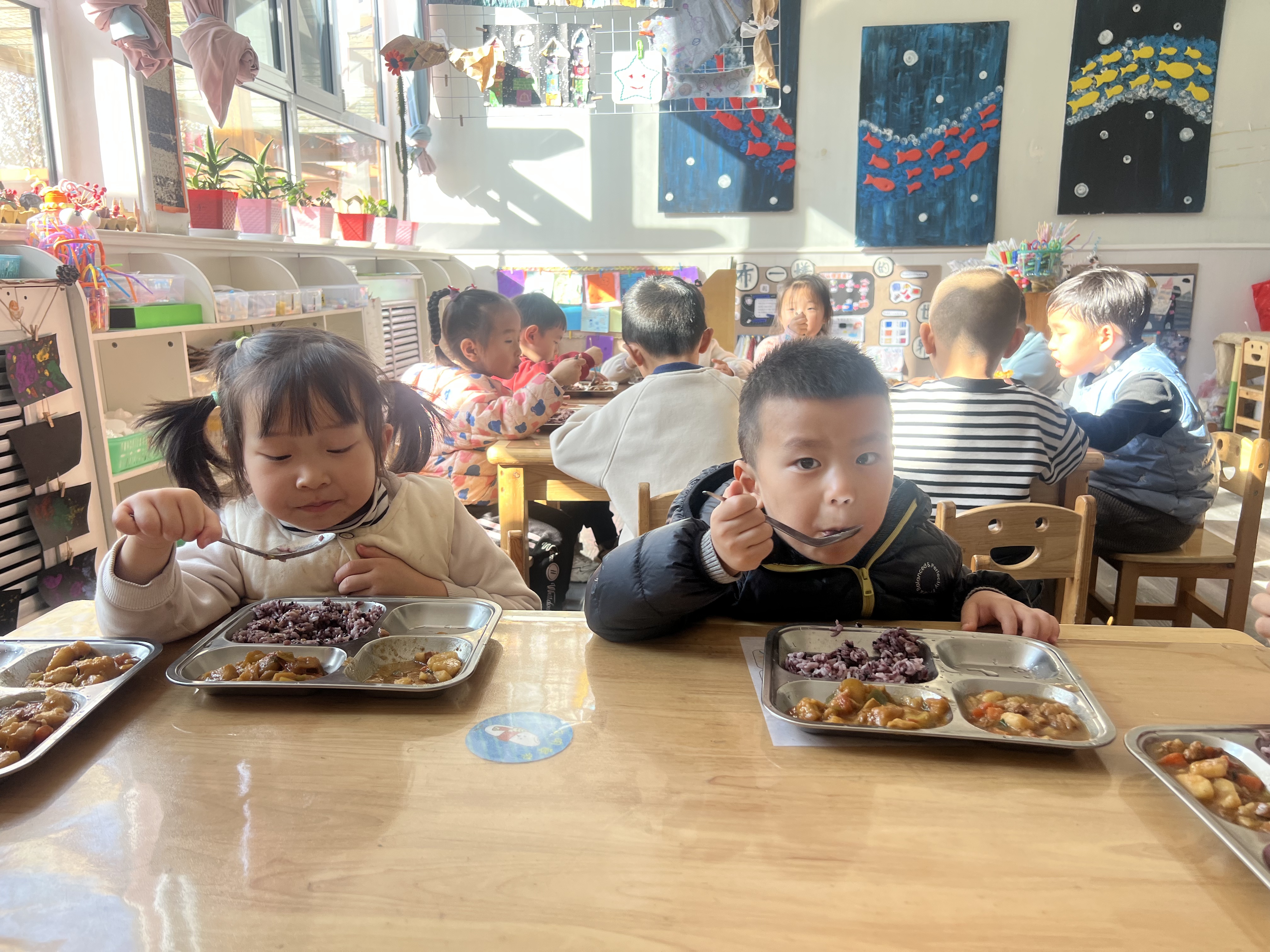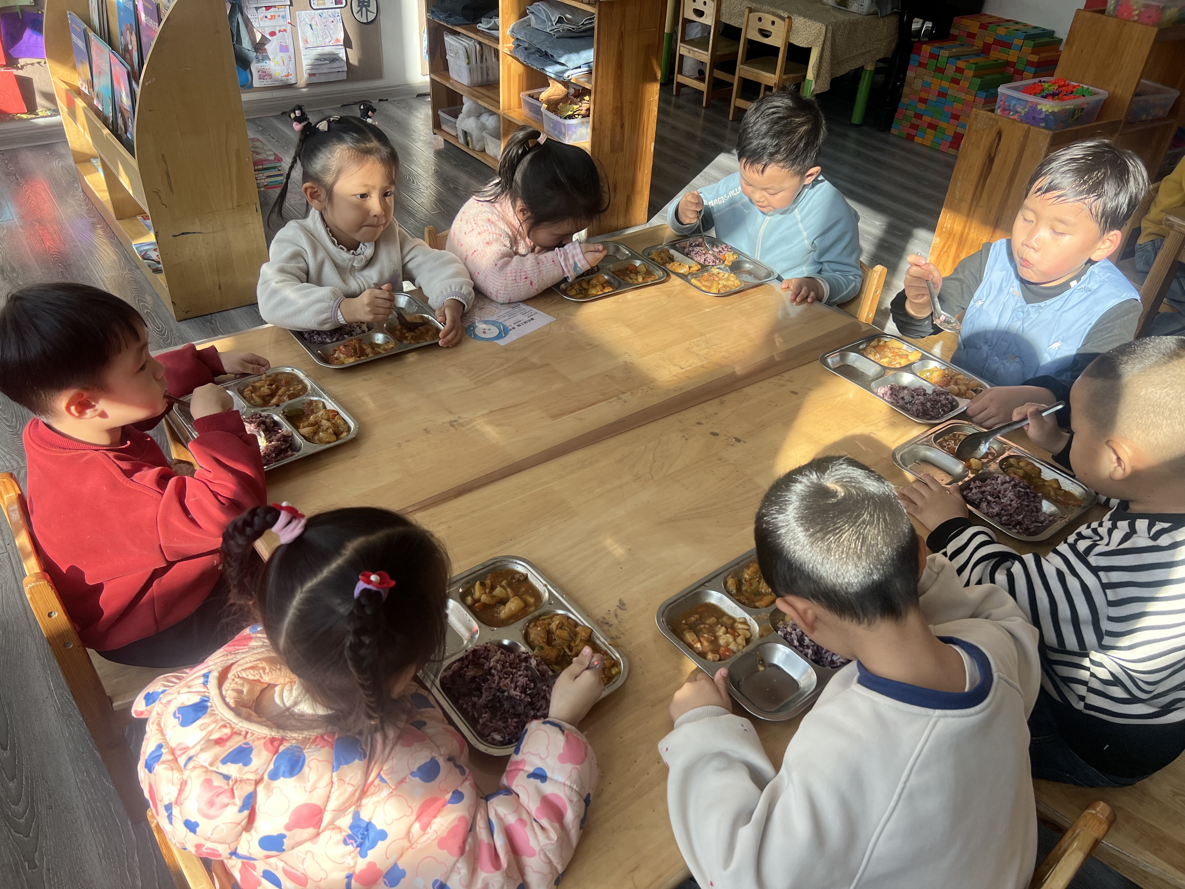 随着保温餐车准时到达出餐口,完成清洁消毒的配餐员们身着统一工装纷纷上前,根据分餐标准进行分装,教师则根据幼儿需求按需调整分量。没一会儿,孩子们的面前便多了一份荤素相宜、营养均衡的餐食。在饭菜的温热香气和碗勺碰撞的清脆声响间,尽显政策关怀与民生暖意。“我特别喜欢吃幼儿园的饭,鸡蛋、牛奶、南瓜还有小馒头、排骨、鸡翅,我非常喜欢吃,幼儿园的饭太香了!”潞城区府前幼儿园学生赵泽铭一边吃饭一边说道。