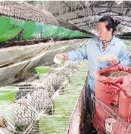 养殖基地工作人员投喂肉兔。