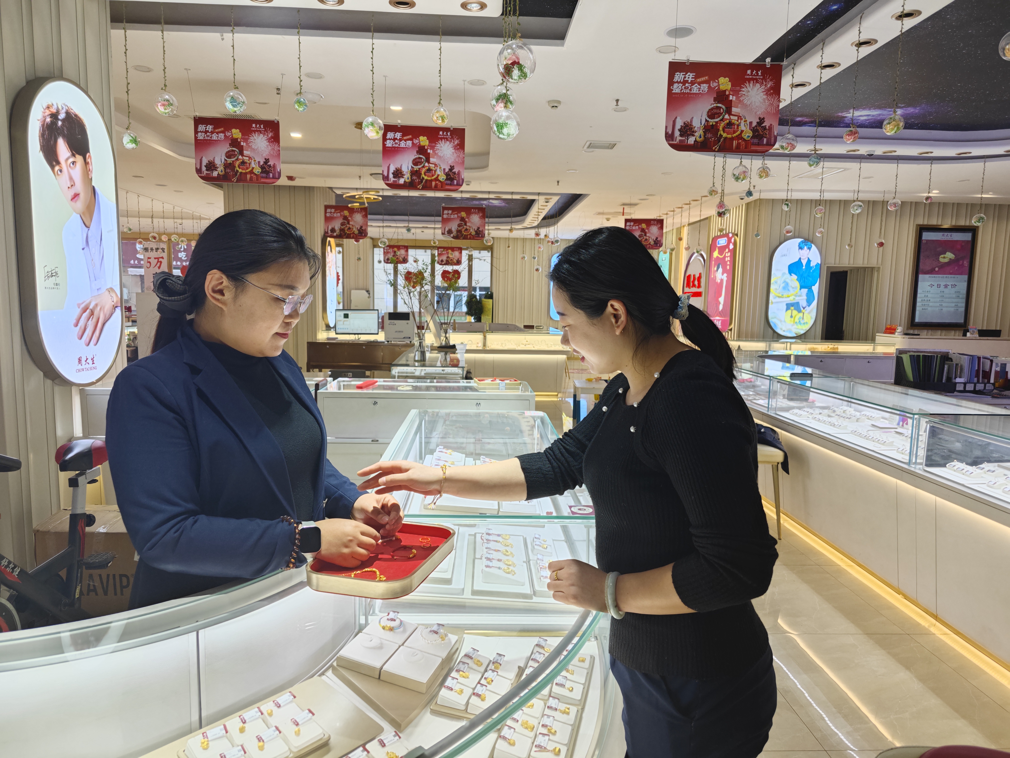 在金店展柜,马年生肖金饰被摆在显眼位置,吸引不少顾客驻足挑选。正在挑选饰品的顾客陈娇笑着说:“今年是我的本命年,特意来选一枚小马戒指,克重合适、价格亲民,希望能讨个龙马精神的好彩头。”