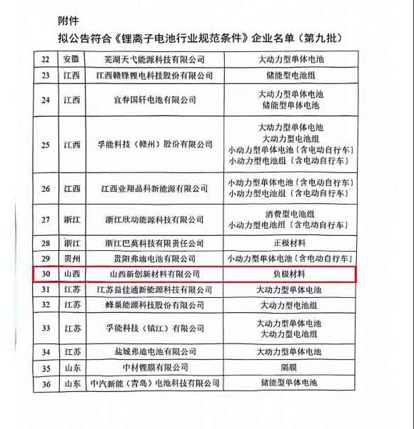 近日,国家工业和信息化部发布《拟公告〈锂离子电池行业规范条件〉企业名单(第九批)》,全国共36家企业入选,山西新创新材料有限公司位列其中,这标志着山西新创公司在锂电行业规范化水平与综合实力再次获得国家层面认可。