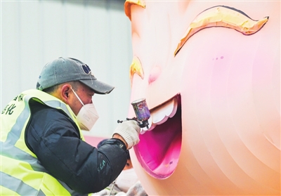 花灯制作工序繁杂,每一步都凝聚着匠心。钢架焊接环节,火花簇簇飞溅,工人严格按照设计图纸精准弯折每一道弧度,为灯组筑牢稳固骨架;随后,灯带被均匀有序地缠绕其上,为花灯注入“光影灵魂”。作为非遗灯艺的核心工序,裱糊与彩绘堪称点睛之笔:裱糊时,工人将彩色绸布仔细贴合骨架,分色拼接间力道均匀,如同为灯组精心“着衣”;彩绘环节更见功力,丙烯喷绘打底,细笔勾勒纹饰,让花灯既饱含神话意境,又彰显非遗文化底蕴。