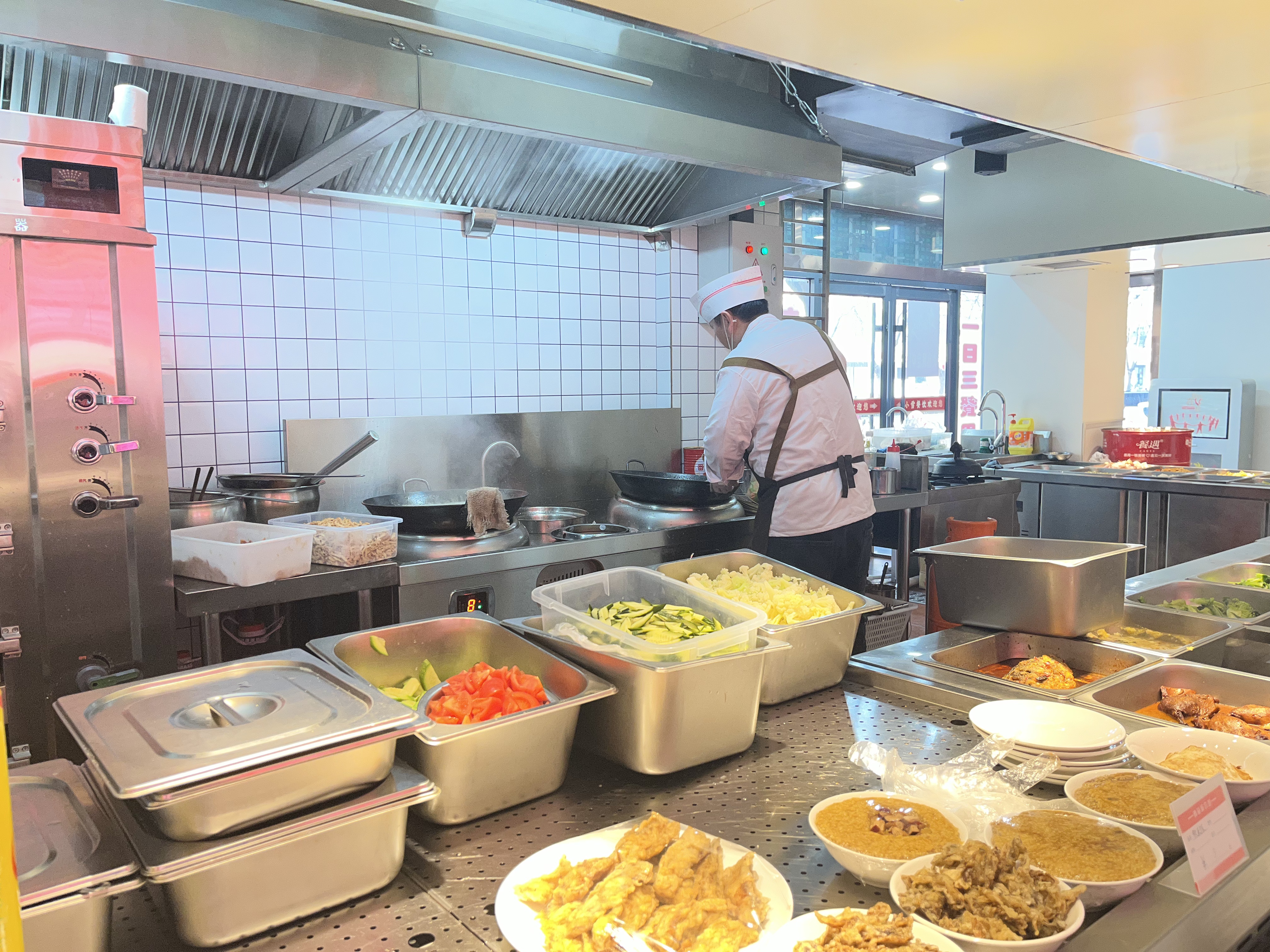 走进慈林店,可视化厨房全程公开食材加工流程,让居民看得放心、吃得安心。餐台上,热菜、凉菜分区整齐陈列,搭配清爽汤品与新鲜水果,每日菜品轮换不重样。食堂贴心配备就餐小推车与托盘,适配单人、多人就餐场景;无接触分饭机可按需提供白米、糙米两种主食。针对老年人、儿童等特殊群体,食堂专门设置软烂菜品区与甜品区,并为60岁以上腿脚不便的老人提供免费上门送餐服务。