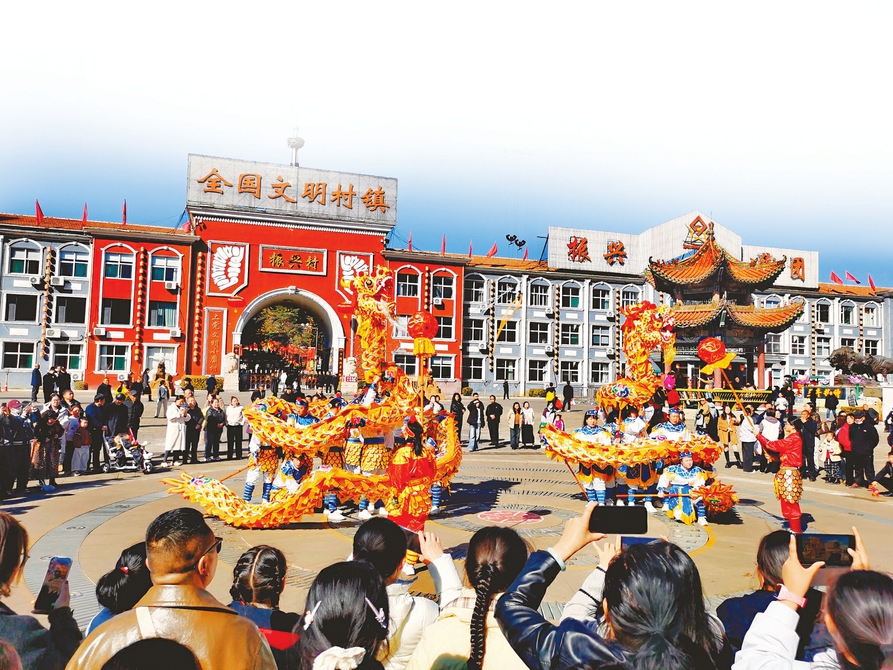 振兴小镇上的舞龙表演引来阵阵喝彩。