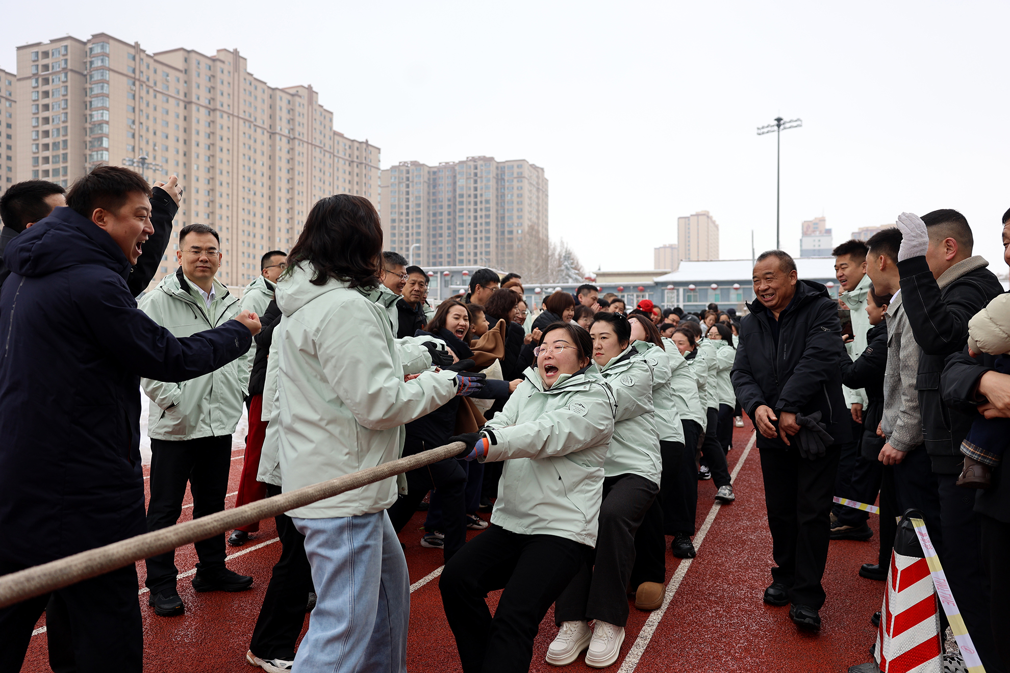 比赛现场,积雪尚未消融,但这并未阻挡参赛队员们的斗志,反而为这场力量较量增添了几分豪情与坚韧。在备受瞩目的女子组比赛中,壶关农商银行的“巾帼英雄”们一路过关斩将,成功战胜在该项目上蝉联冠军、实力强劲的壶化集团代表队。面对这座“大山”,壶关农商银行的队员们毫无惧色。决赛哨声一响,双方立刻陷入激烈的拉锯战。麻绳中间的红色标记在中线附近来回移动,场面一度胶着。壶关农商银行的队员们脚下生根,紧咬牙关,逆转局势。场边的加油声、呐喊声震耳欲聋,与簌簌落下的雪花交织在一起,将现场气氛推向了最高潮。