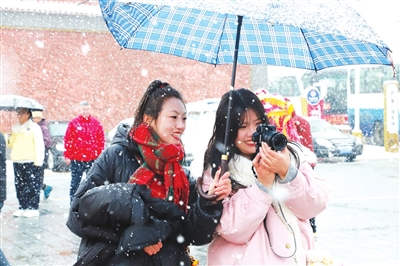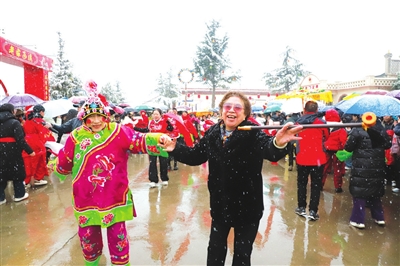 “党的光辉照我心……”潞城区文化馆合唱队与游客齐声高唱《唱支山歌给党听》。现场,红旗漫卷,歌声与雪花交融。游客中,一位白发老者紧攥红旗和着节拍轻唱。微子村的威风锣鼓《盛世欢歌》铿锵有力,划旱船、扛妆、舞龙等民俗轮番上演,游客融入表演队伍,伴着音乐腾跃起舞,沉浸其中。